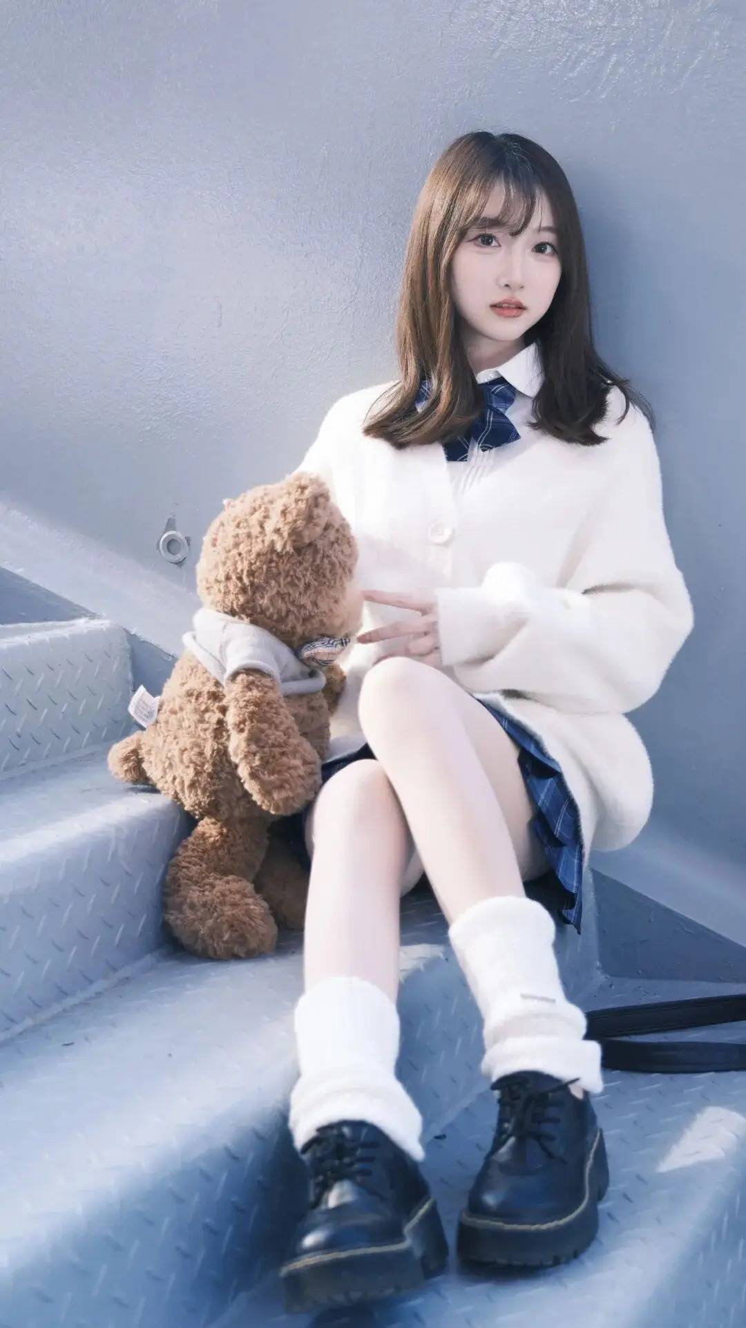人物怀抱毛绒玩偶,指尖轻触玩偶细节,让互动感自然流露,消解了摆拍的刻意感。蜷坐的姿态松弛舒展,腿部线条随台阶错落开来,不显局促。宽松毛衣的蓬松质感衬得动作更柔和,神态偏向玩偶而非镜头,让画面多了几分随性的温柔,日常又有氛围感